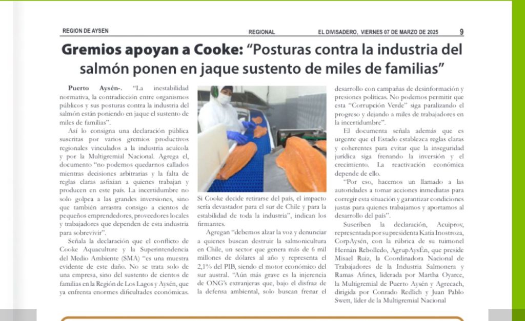 Gremios apoyan a Cooke: «Postura contra la Industria del salmón ponen en jaque el sustento de miles de familia