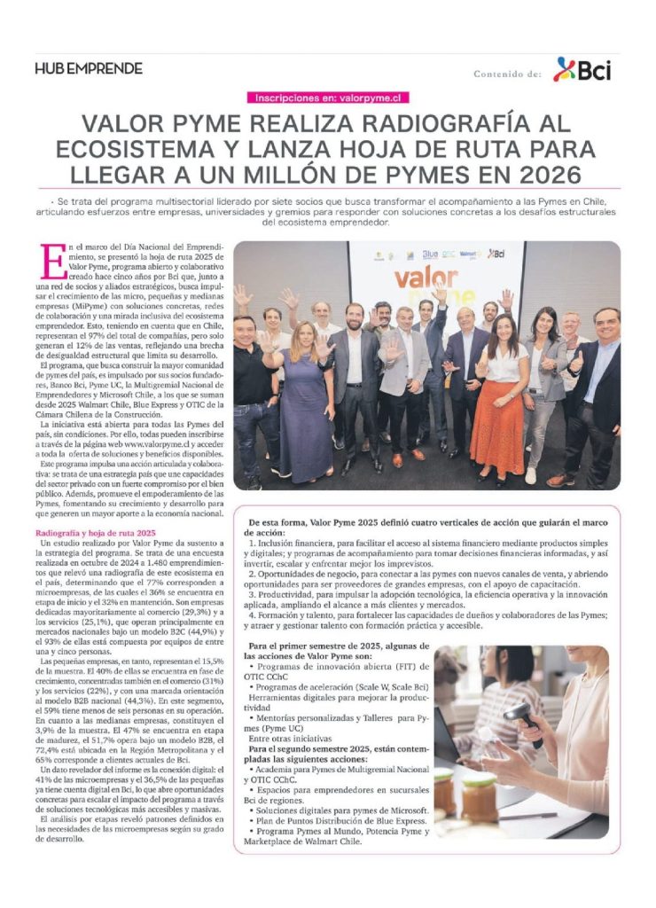 En el marco del Día Nacional del Emprendimiento, se presentó la hoja de ruta 2025 de Valor Pyme, el programa multisectorial lanzado hace cinco años por Bci que, junto a una red de socios y aliados estratégicos, busca impulsar el crecimiento sostenible de las micro, pequeñas y medianas empresas (MiPyme) con soluciones concretas, redes de apoyo y herramientas para potenciar el ecosistema emprendedor. Esto, teniendo en cuenta que en Chile, las MiPyme representan el 98,6% de las empresas y generan el 12% de las ventas, reflejando una brecha de productividad que requiere ser abordada.