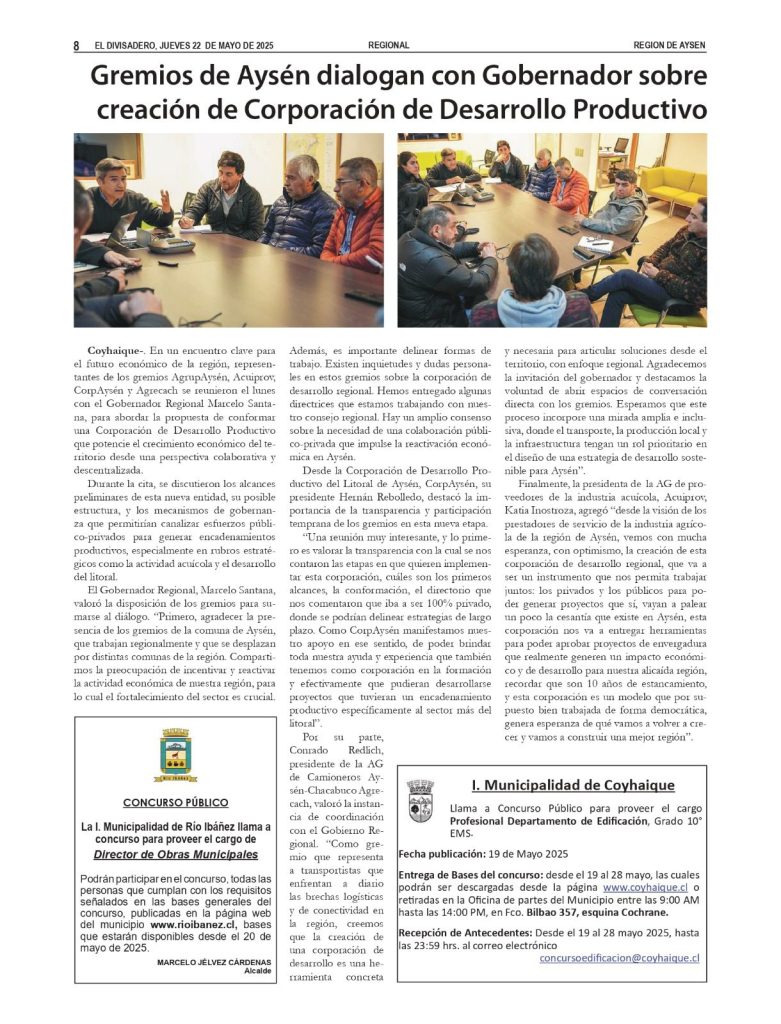 En un encuentro clave para el futuro económico de la región, representantes de los gremios AgrupAysén, Acuiprov, CorpAysén y Agrecach se reunieron el lunes con el Gobernador Regional Marcelo Santana, para abordar la propuesta de conformar una Corporación de Desarrollo Productivo que potencie el crecimiento económico del territorio desde una perspectiva colaborativa y descentralizada.