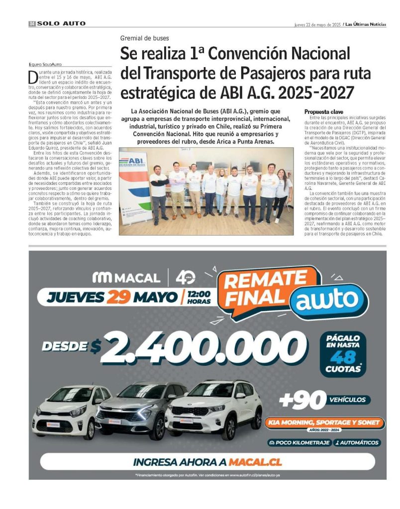 La Asociación Nacional de Buses (ABI A.G.), gremio que agrupa a empresas de transporte interprovincial, internacional, industrial, turístico y privado en Chile, realizó su Primera Convención Nacional. Hito que reunió a empresarios y proveedores del rubro, desde Arica a Punta Arenas.