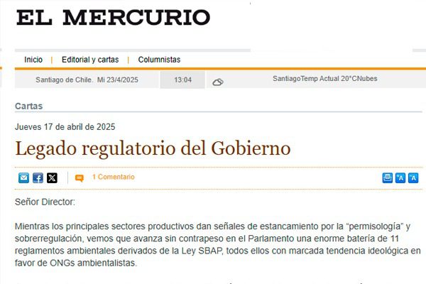 Señor Director: Mientras los principales sectores productivos dan señales de estancamiento por la ‘permisología’ y sobrerregulación, vemos que avanza sin contrapeso en el Parlamento una enorme batería de 11 reglamentos ambientales derivados de la Ley SBAP, todos ellos con marcada tendencia ideológica en favor de ONGs ambientalistas. Como ejemplo, el reglamento que regula la clasificación […]